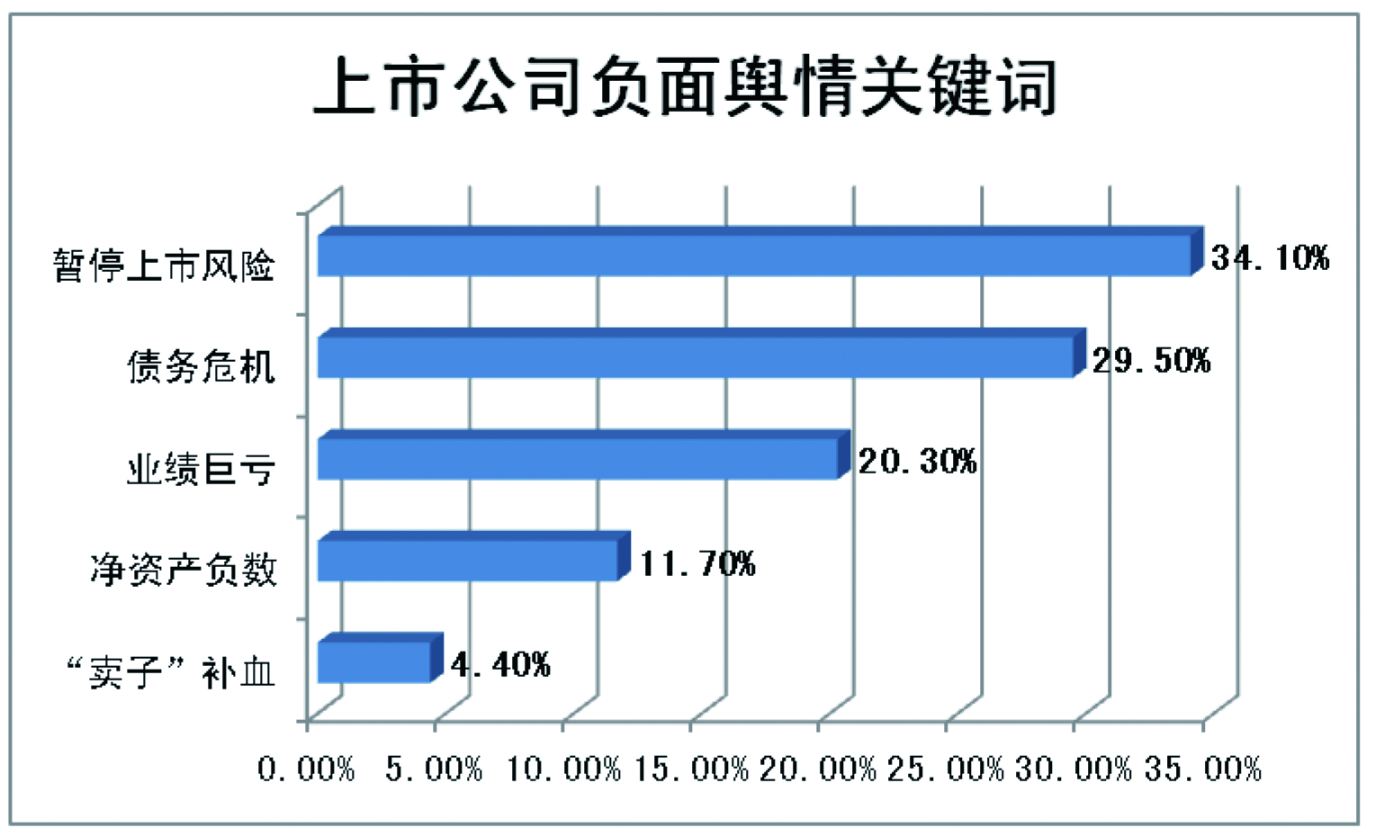 1.上市公司保壳压力是关注焦点。通过鹰眼舆情大数据分析发现,上周十大负面舆情事件中,被媒体报道最多的关键词依次为:暂停上市风险、债务危机、业绩巨亏、净资产负数、卖子补血等。(见下图)