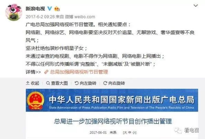 今年11月末,网络上曾流传出一则网络视听节目新规,新规中明确规定:重点网络视听节目将由制作公司备案后提交给省级广播电视局审核。审核流程包括在拍摄前对拍摄规划剧本的审核,以及成片后对上线成片的审核。网络平台只能采购由广电部门过审后,取得上线备案号的视听内容。